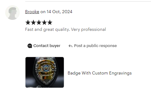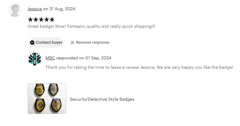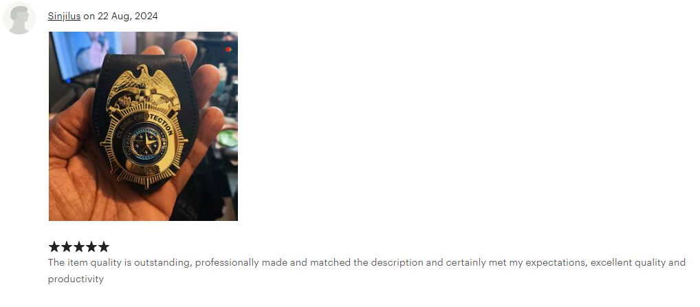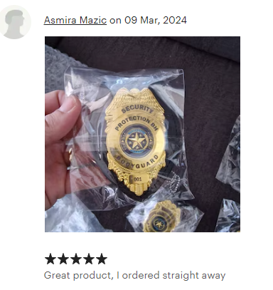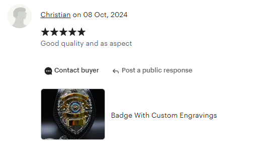 Along with selling our products to governments & film production companies worldwide, we also sell via Etsy and offer cosplay badges to customers. We have excellent customer reviews and feedback with all our orders!